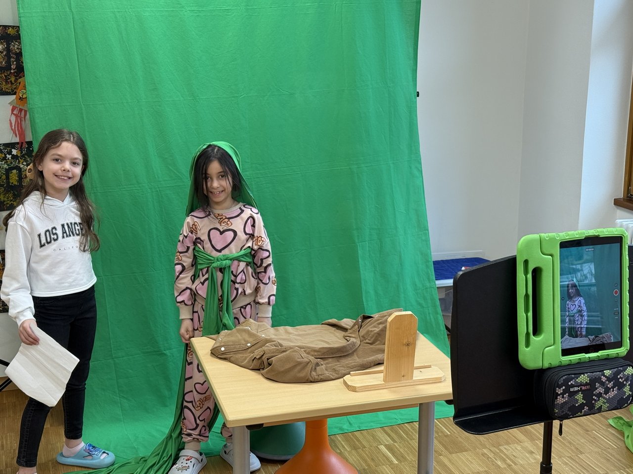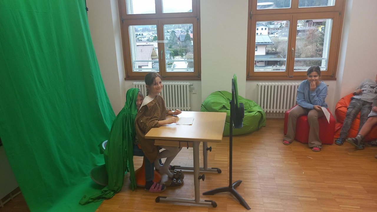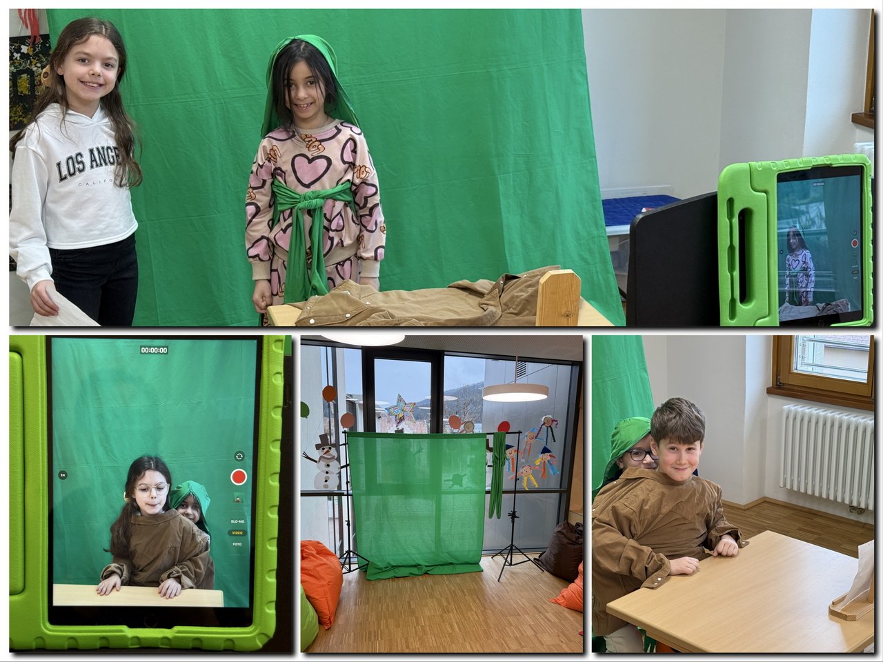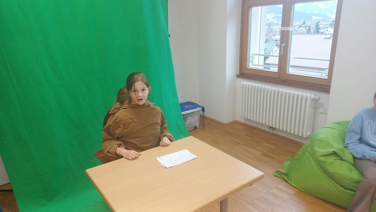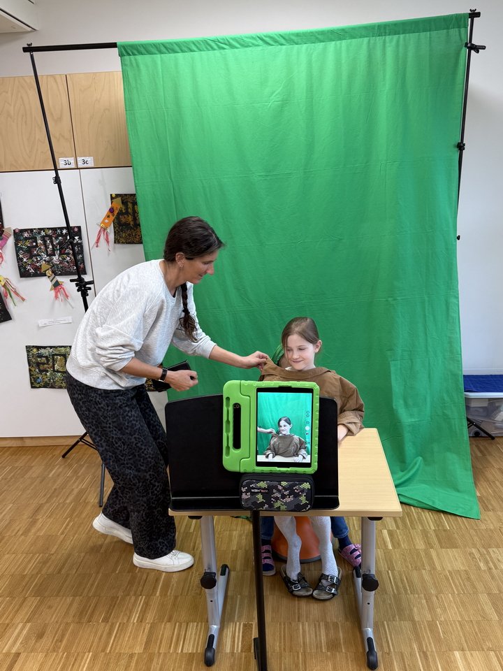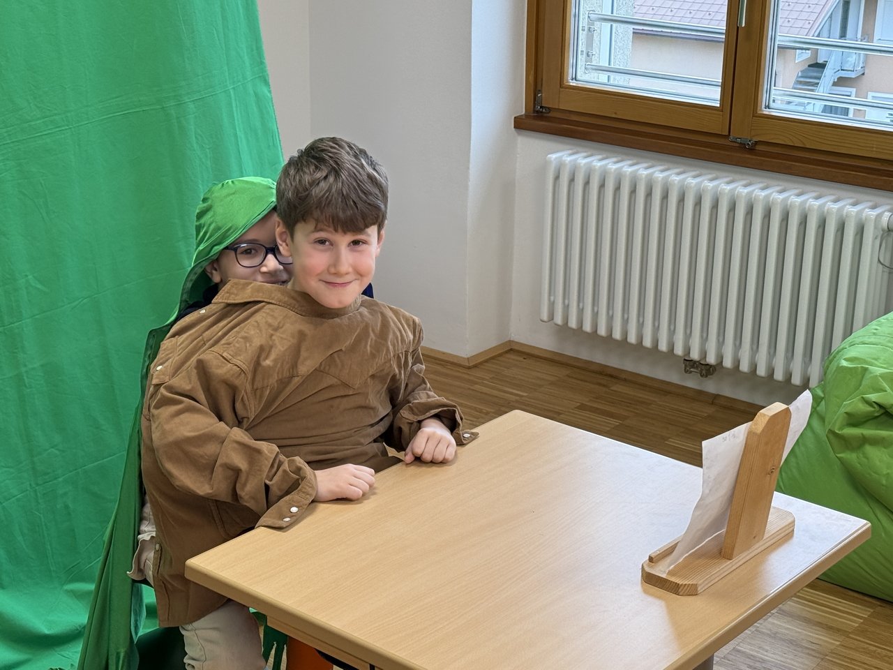 Dabei arbeitete immer ein Kind mit einem Partner oder einer Partnerin zusammen – einer vorne, der andere versteckt dahinter. So entstanden witzige Wettershows mit lebendigen Gesten, flatternden Händen als Windböen und schmelzenden Bewegungen für den Sonnenschein. Besonders spannend wurde es beim Filmen: Die Szenen wurden vor einem Green Screen aufgenommen.