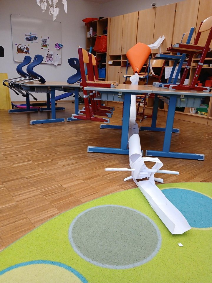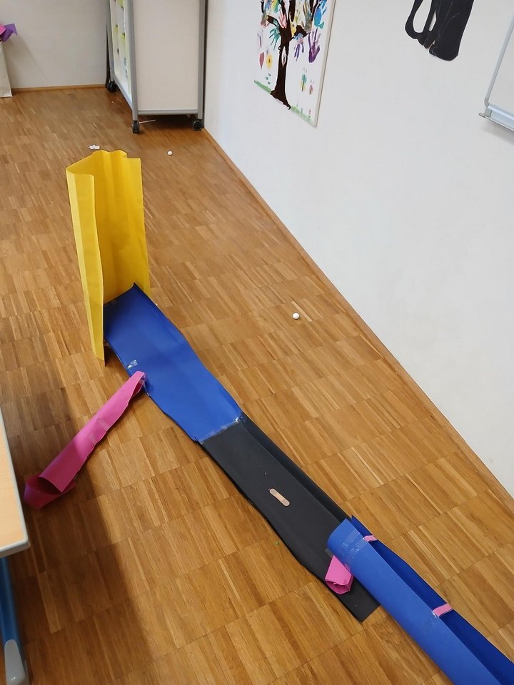 Ganz im Sinne von MINT wurde ausprobiert, überlegt und immer wieder verbessert. Wie steil darf eine Bahn sein, damit der Filzball schnell genug rollt? Welche Richtungen sind möglich? Und welche besonderen Bauweisen braucht es, damit alles stabil hält? Gemeinsam suchten die Kinder nach Lösungen, testeten verschiedene Varianten und lernten spielerisch die Grundlagen von Technik und Physik kennen.
