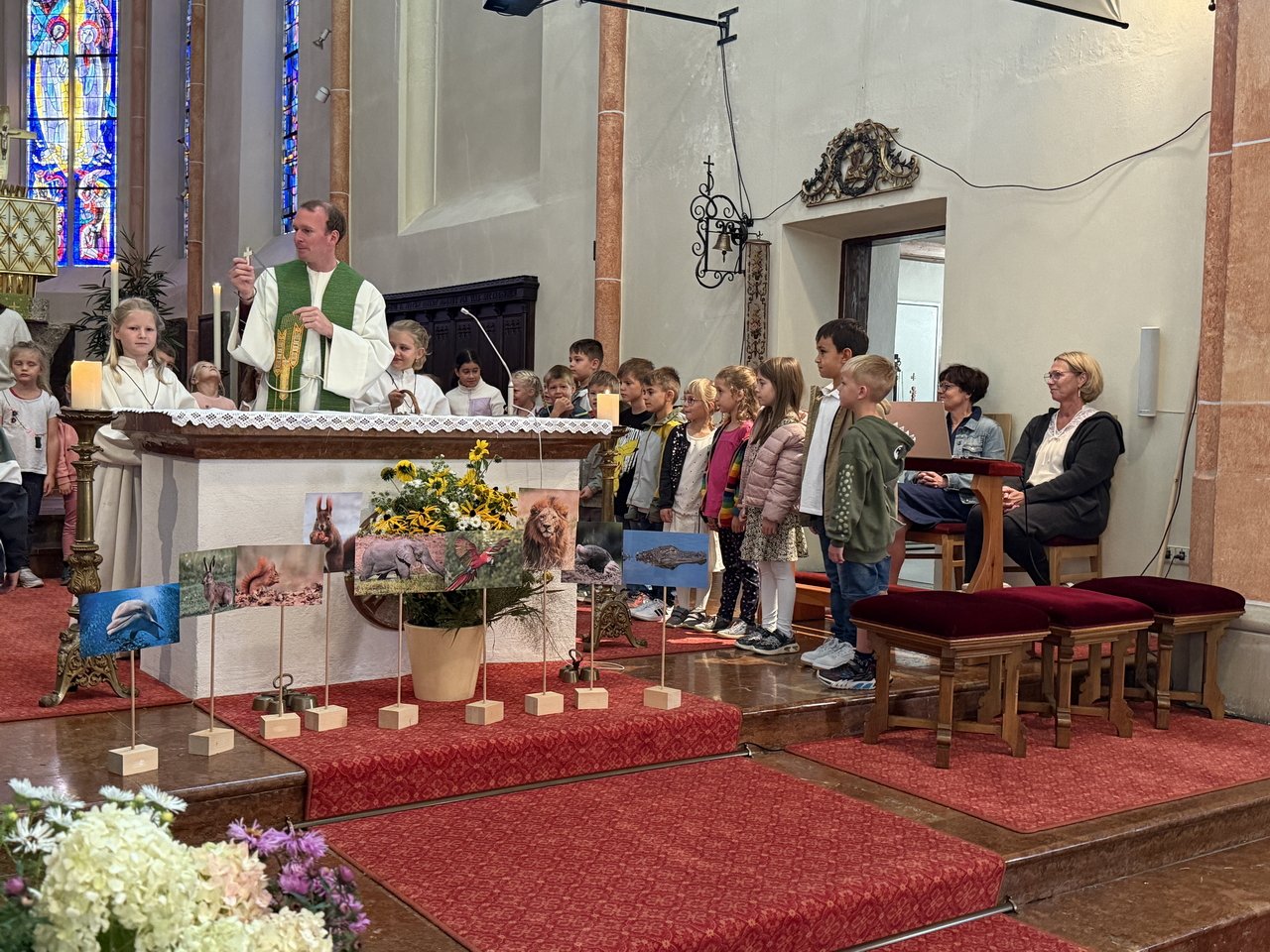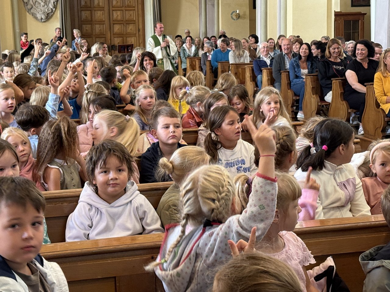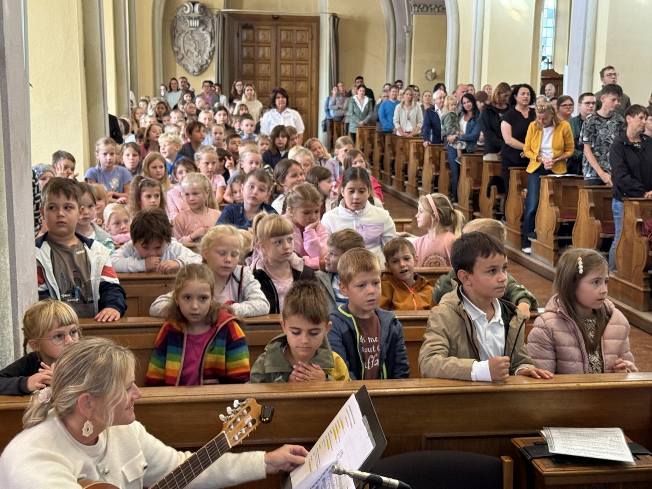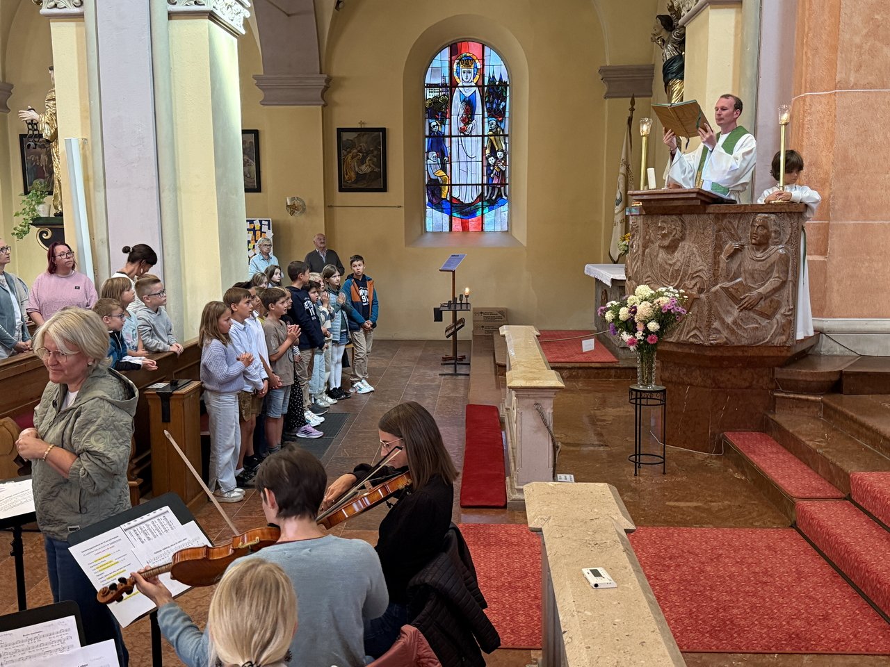 Der Gottesdienst wurde musikalisch begleitet und durch viele schöne Lieder lebendig gestaltet. Besonders feierlich war der Moment, als unser Herr Pfarrer die Vorschulkinder und Erstklässler segnete. Als Zeichen für den Start in einen neuen Lebensabschnitt erhielten sie ein kleines Geschenk – ein Kreuz zum Umhängen, das sie daran erinnern soll: Jesus geht mit dir.