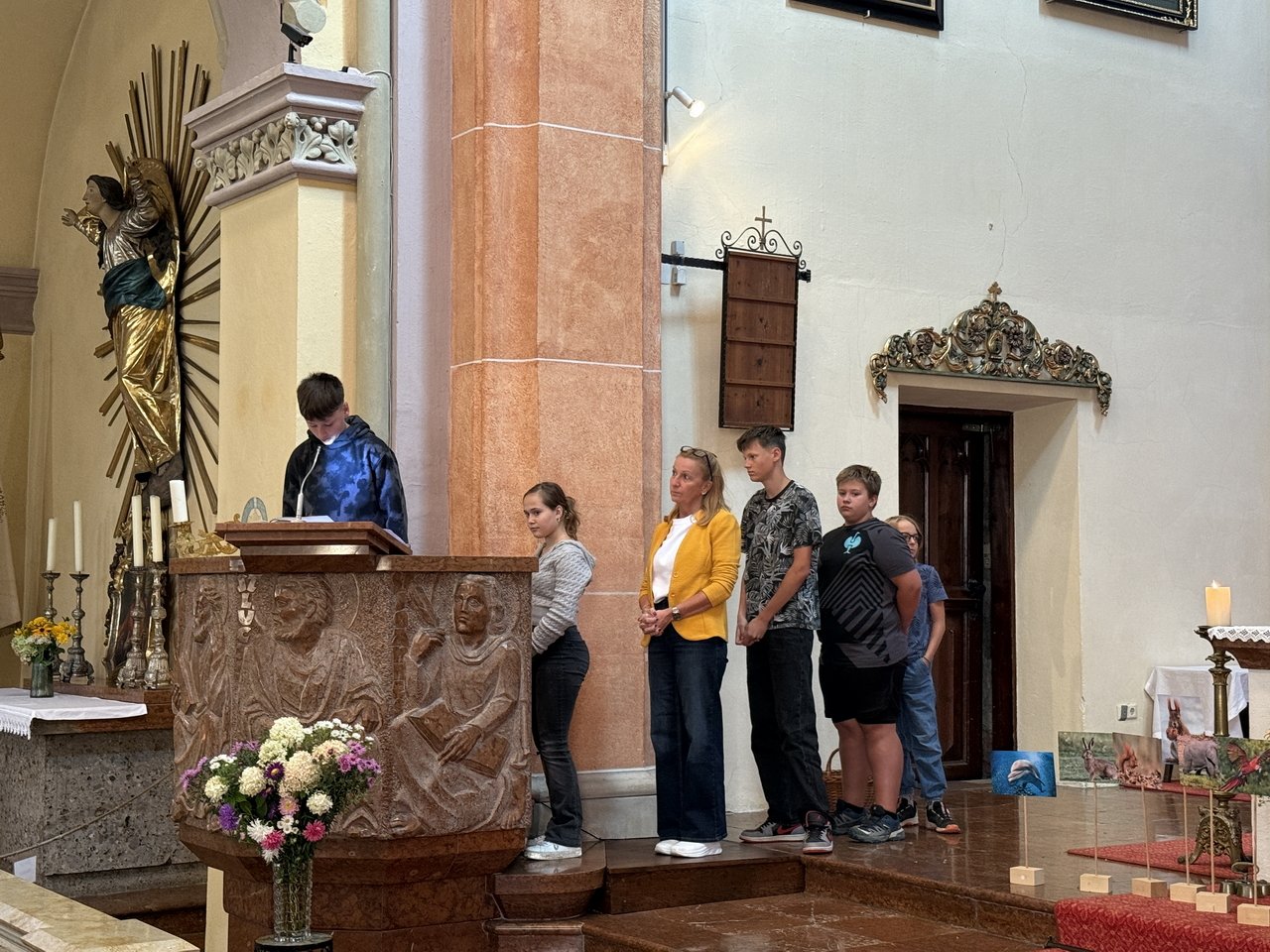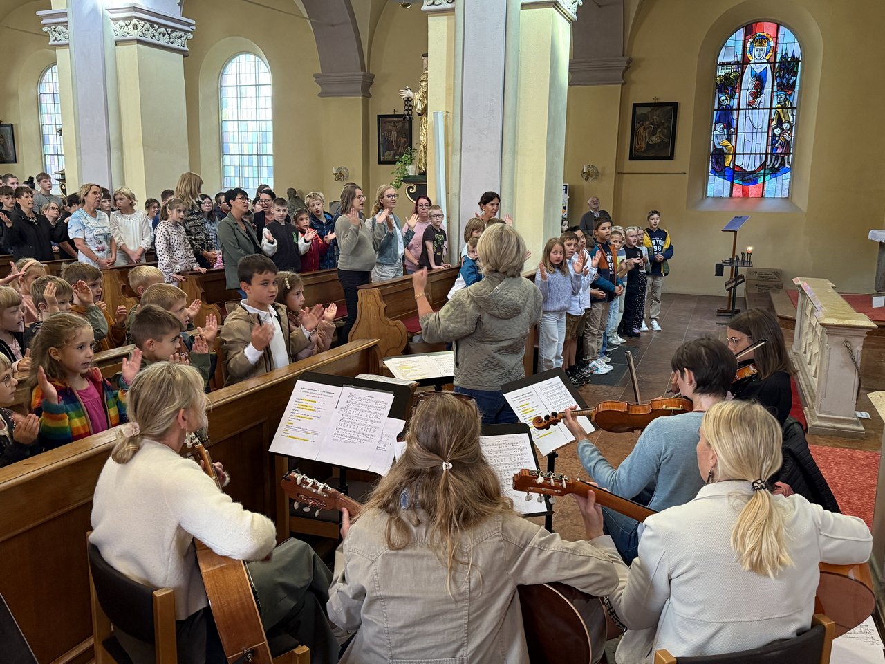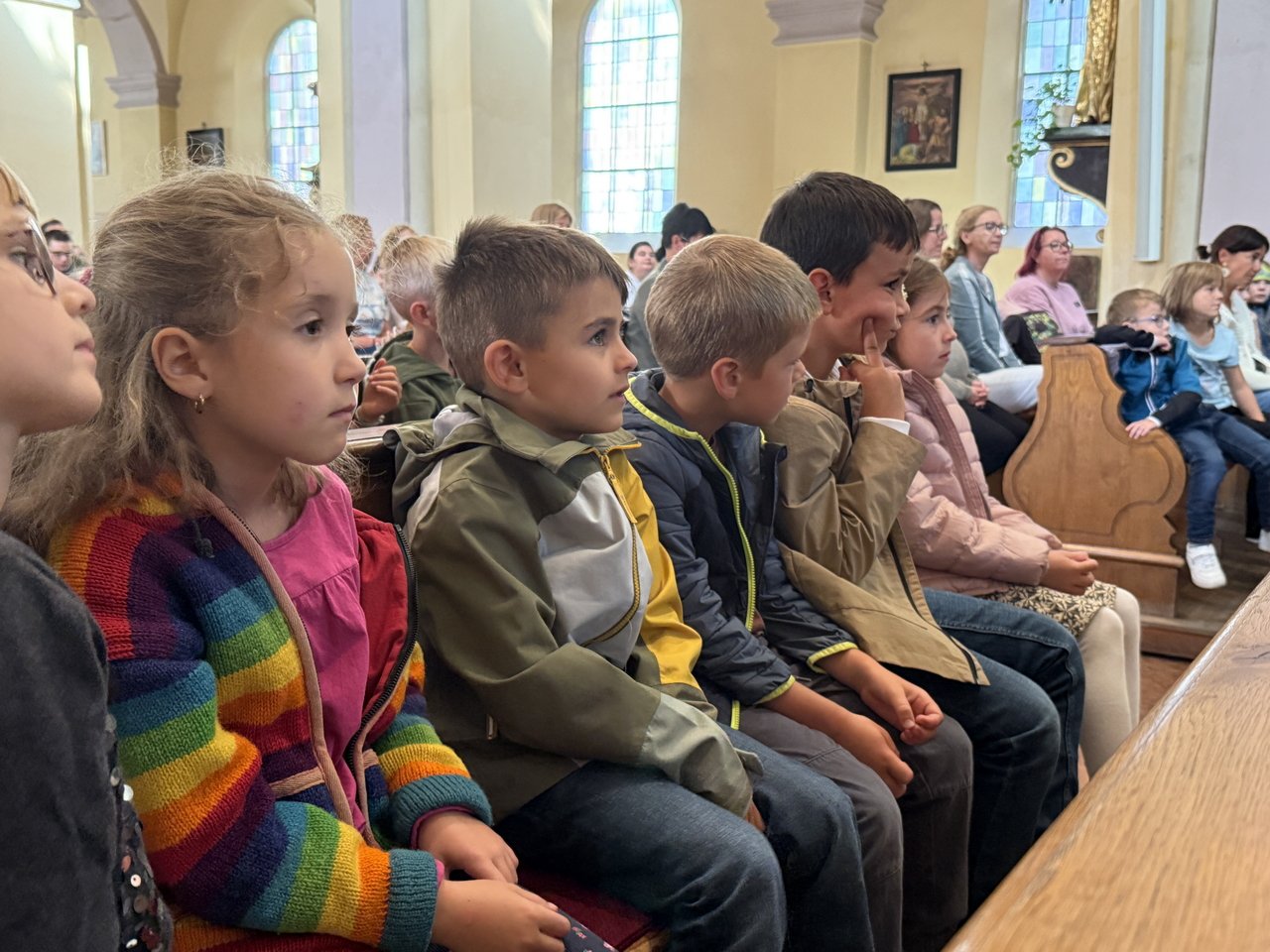 Der Gottesdienst wurde musikalisch begleitet und durch viele schöne Lieder lebendig gestaltet. Besonders feierlich war der Moment, als unser Herr Pfarrer die Vorschulkinder und Erstklässler segnete. Als Zeichen für den Start in einen neuen Lebensabschnitt erhielten sie ein kleines Geschenk – ein Kreuz zum Umhängen, das sie daran erinnern soll: Jesus geht mit dir.