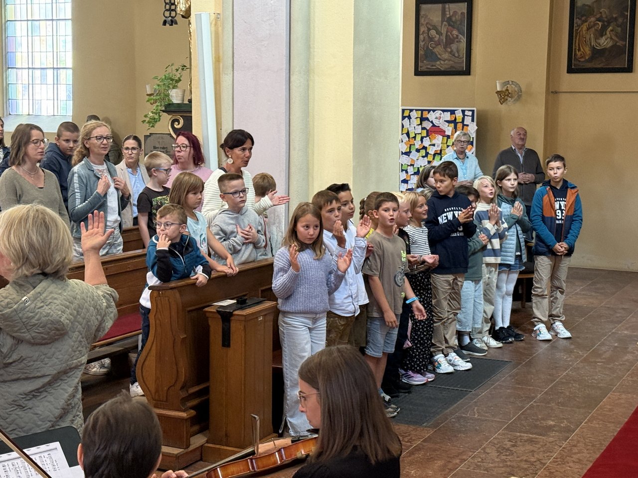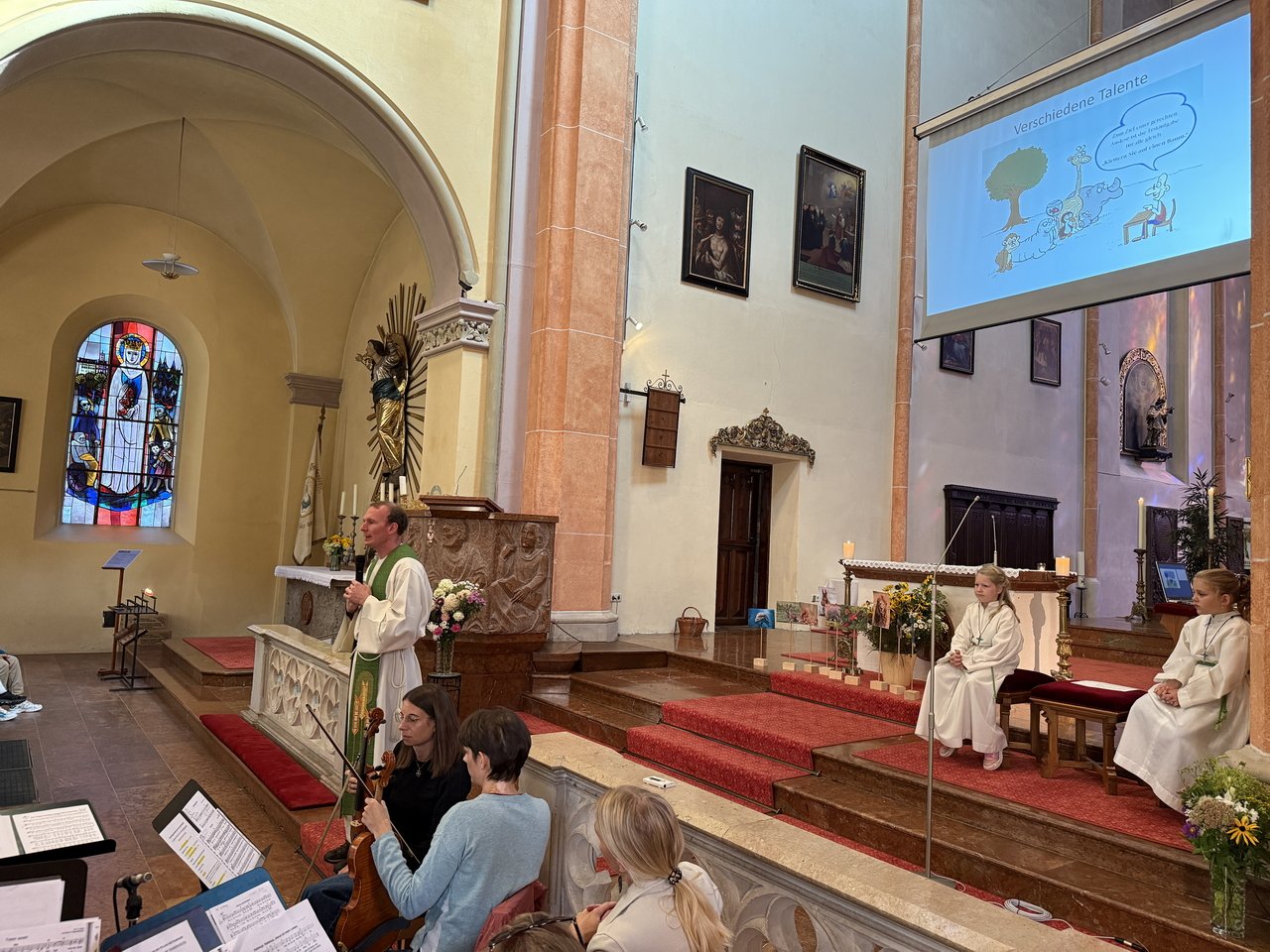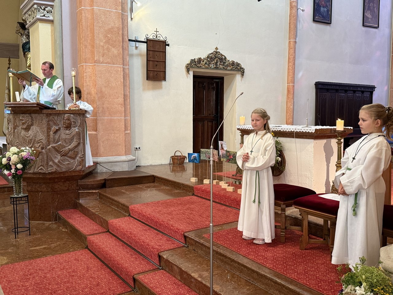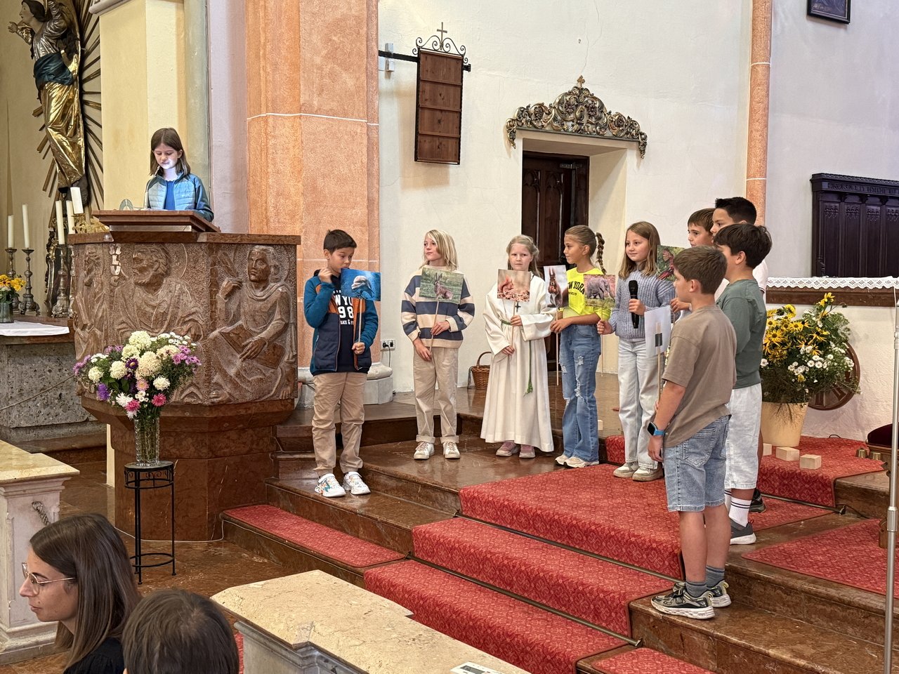 Der Gottesdienst wurde musikalisch begleitet und durch viele schöne Lieder lebendig gestaltet. Besonders feierlich war der Moment, als unser Herr Pfarrer die Vorschulkinder und Erstklässler segnete. Als Zeichen für den Start in einen neuen Lebensabschnitt erhielten sie ein kleines Geschenk – ein Kreuz zum Umhängen, das sie daran erinnern soll: Jesus geht mit dir.