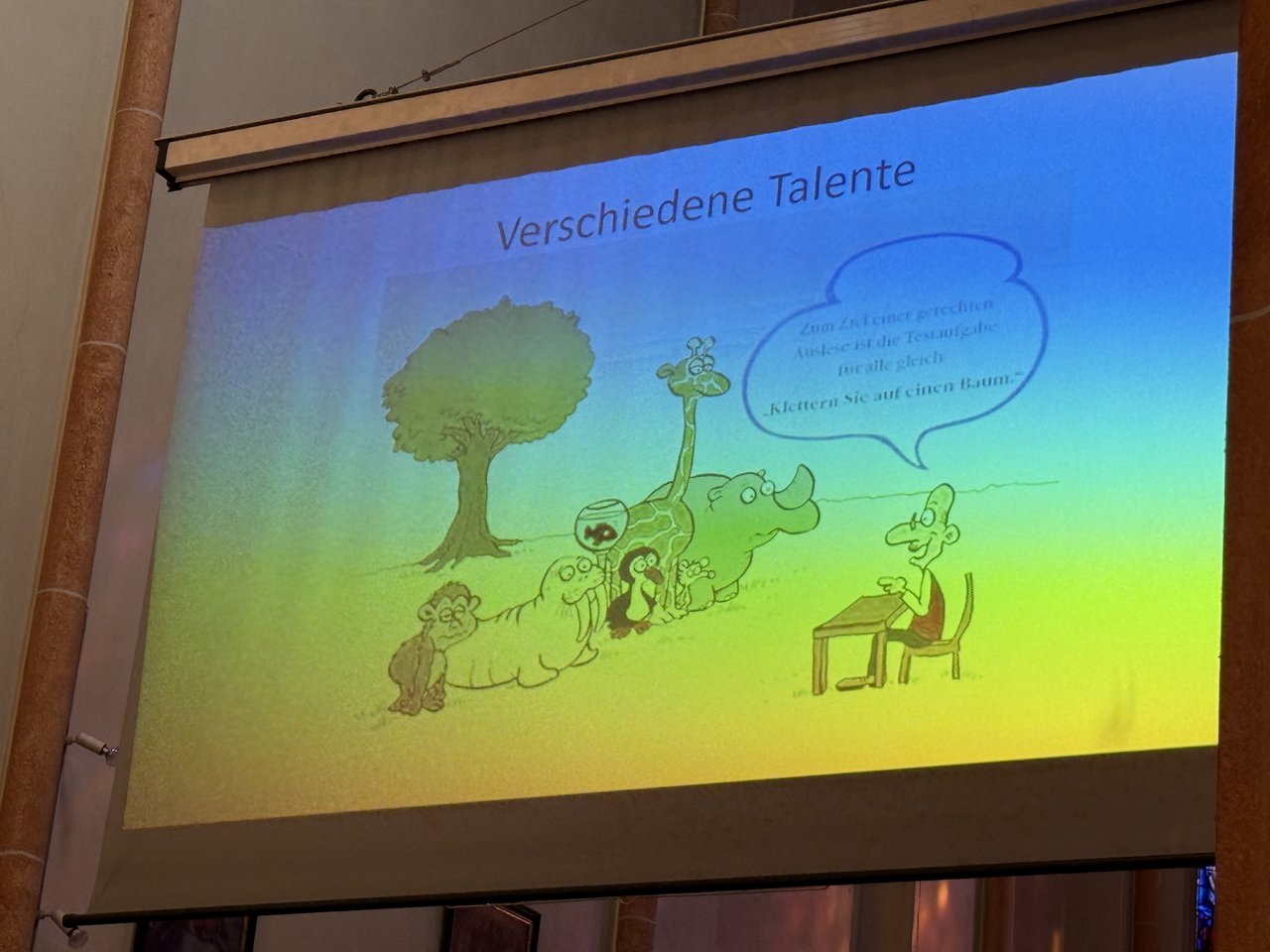 Unter dem Motto „Entdecke, was in dir steckt“ drehte sich alles um Talente und Begabungen. In einer liebevoll erzählten Geschichte wurde deutlich: Keiner kann alles – aber jeder kann etwas. Die Tiere in der Geschichte besuchten eine Schule, in der plötzlich alle gleich gut klettern, schwimmen und laufen sollten. Dabei wurde klar, wie wichtig es ist, die individuellen Stärken jedes Einzelnen zu erkennen und wertzuschätzen.