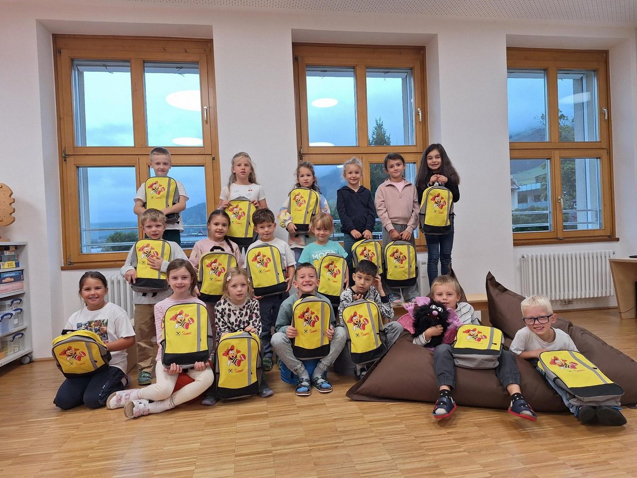 Die Warnwesten und einige weitere Überraschungen im Inneren der Rucksäcke erfreuten so manches Klassentier- und Kinderherz und sorgten für viel Gelächter, als die Fledermaus mit einer Warnweste und hocherfreut über ihre neu gewonnene Sichtbarkeit, losfliegen wollte. Wir bedanken uns bei der Raiffeisenbank, die auch dieses Jahr wieder für die Sichtbarkeit unserer Kinder im Straßenverkehr sorgte.