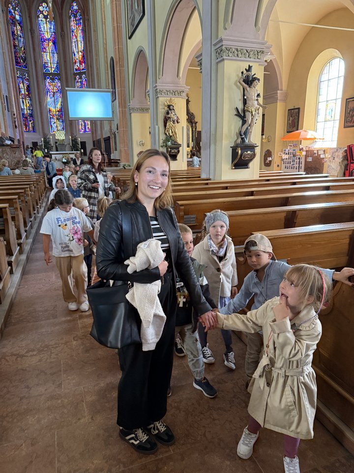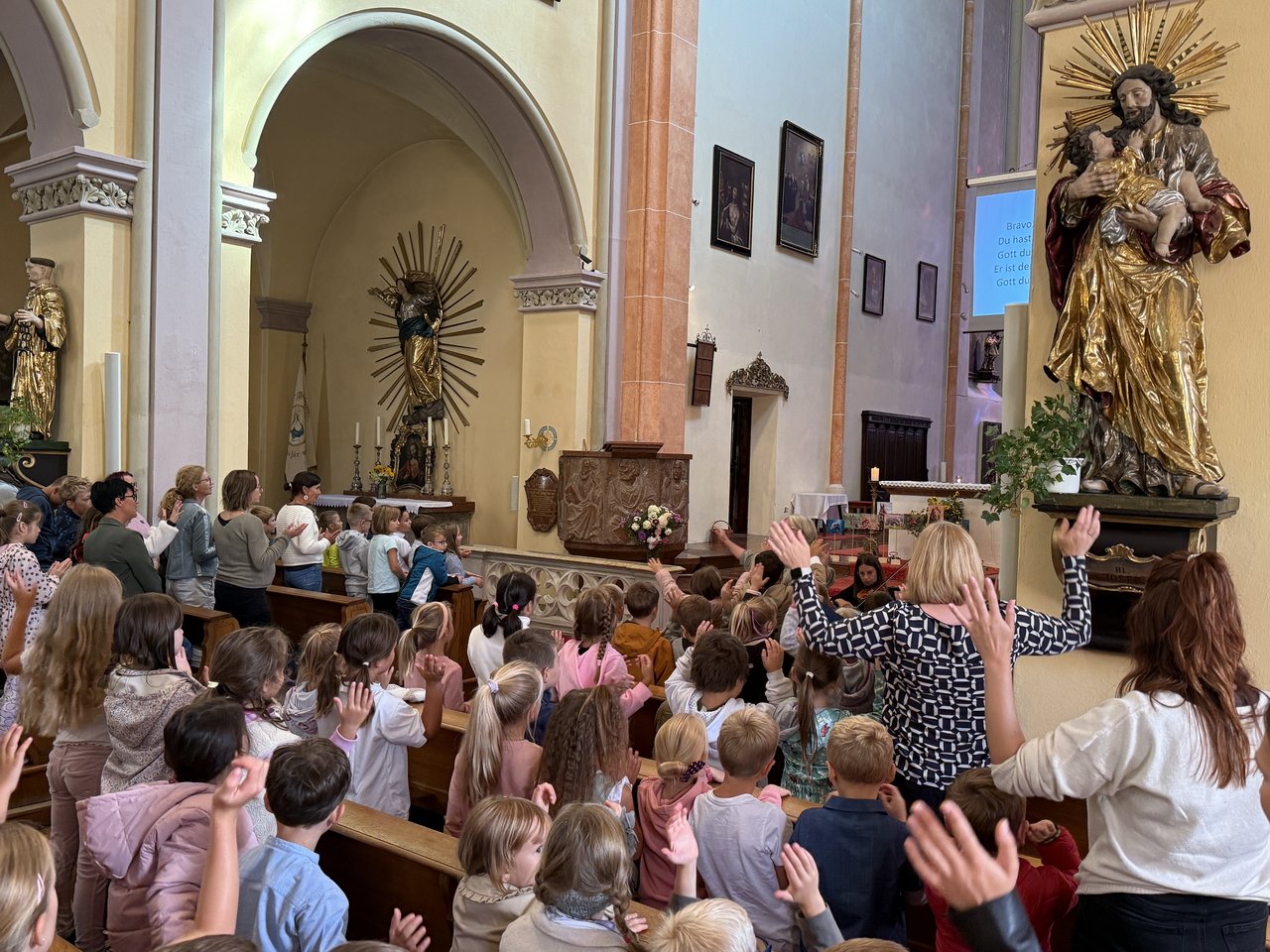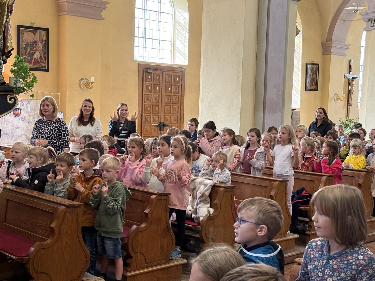Der Gottesdienst wurde musikalisch begleitet und durch viele schöne Lieder lebendig gestaltet. Besonders feierlich war der Moment, als unser Herr Pfarrer die Vorschulkinder und Erstklässler segnete. Als Zeichen für den Start in einen neuen Lebensabschnitt erhielten sie ein kleines Geschenk – ein Kreuz zum Umhängen, das sie daran erinnern soll: Jesus geht mit dir.