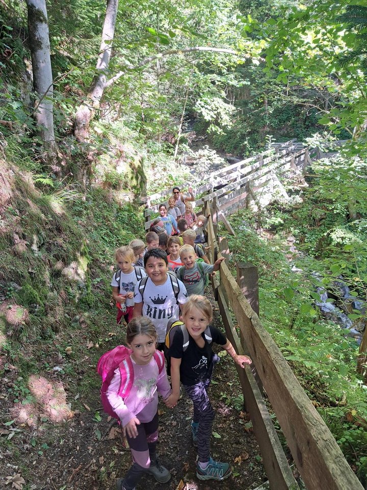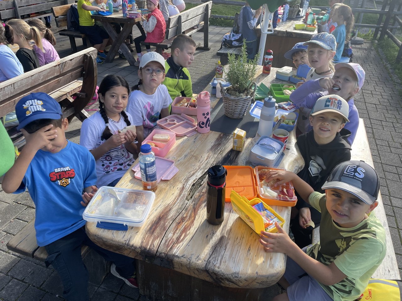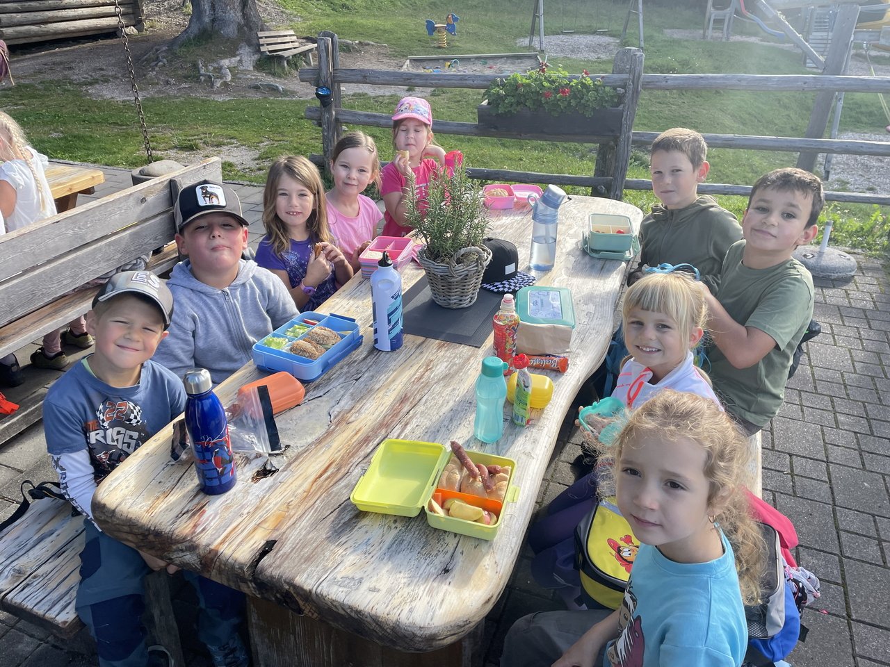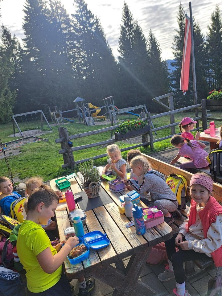 Der erste gemeinsame Wandertag der 1. Klassen führte über einen abwechslungsreichen Waldweg zur Bürgerbergalm. Nach dem Aufstieg wurde erst einmal gejausnet. Anschließend wurde der Spielplatz mit großer Begeisterung erobert – Bewegung, Spiel und Spaß standen im Mittelpunkt.