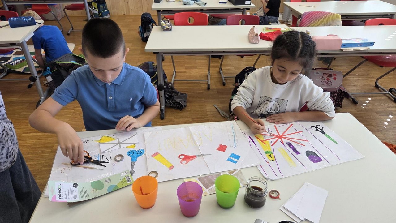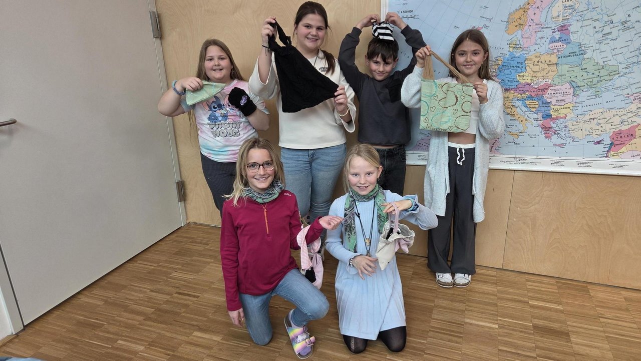 Im praktischen Teil gestalteten die Kinder mithilfe einer Figurine zunächst einen Entwurf für ein mitgebrachtes Kleidungsstück. Sie überlegten, wie sie dieses durch Upcycling verändern oder aufwerten möchten. Mit viel Motivation wurde genäht, bemalt, geschnitten und appliziert. Es entstanden individuelle Werkstücke wie Taschen, Stirnbänder, gekürzte Hosen, Handschuhe, Scrunchies oder neu gestaltete T-Shirts. Manche Kinder schufen wahre Meisterstücke, andere lernten aus kleinen Fehlern – und genau das gehört zum kreativen Prozess dazu.