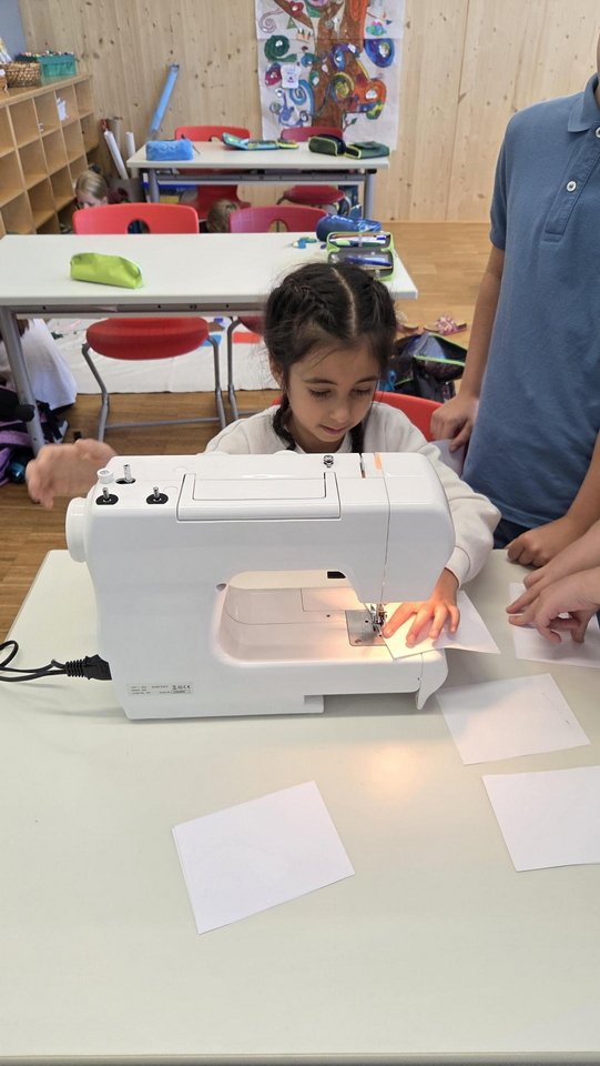 Im Werkunterricht setzten sich die vierten Klasse intensiv mit dem Thema Nähen und Nachhaltigkeit auseinander. In einer Einführungsstunde lernten die Kinder den Umgang mit der Nähmaschine kennen und machten erste Erfahrungen mit Nähen auf Papier. Auch das Lesen von Pflegeetiketten wurde thematisiert.